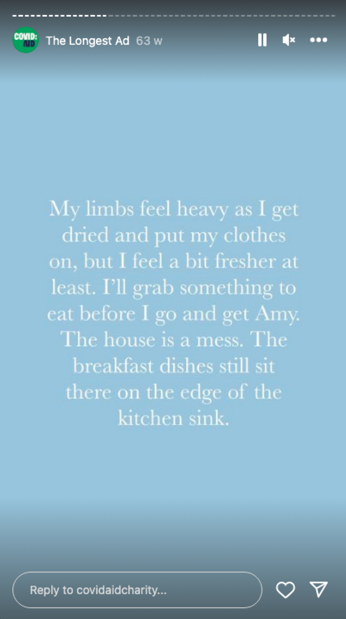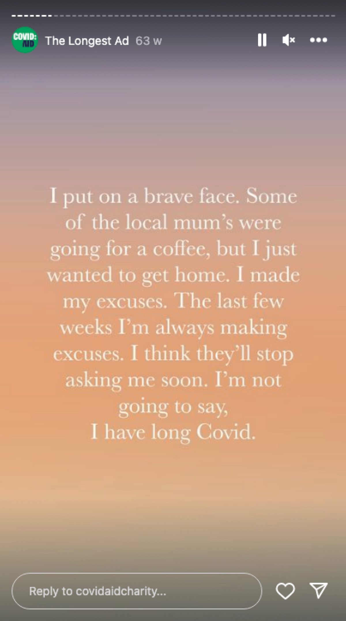 We also worked with The Leith Agency to create The Longest Ad; their creative team brilliantly encapsulated what it can be like to live with Long Covid. The Longest Ad won at The Drum Roses Awards, received international recognition, and highlighted the need for support and action.