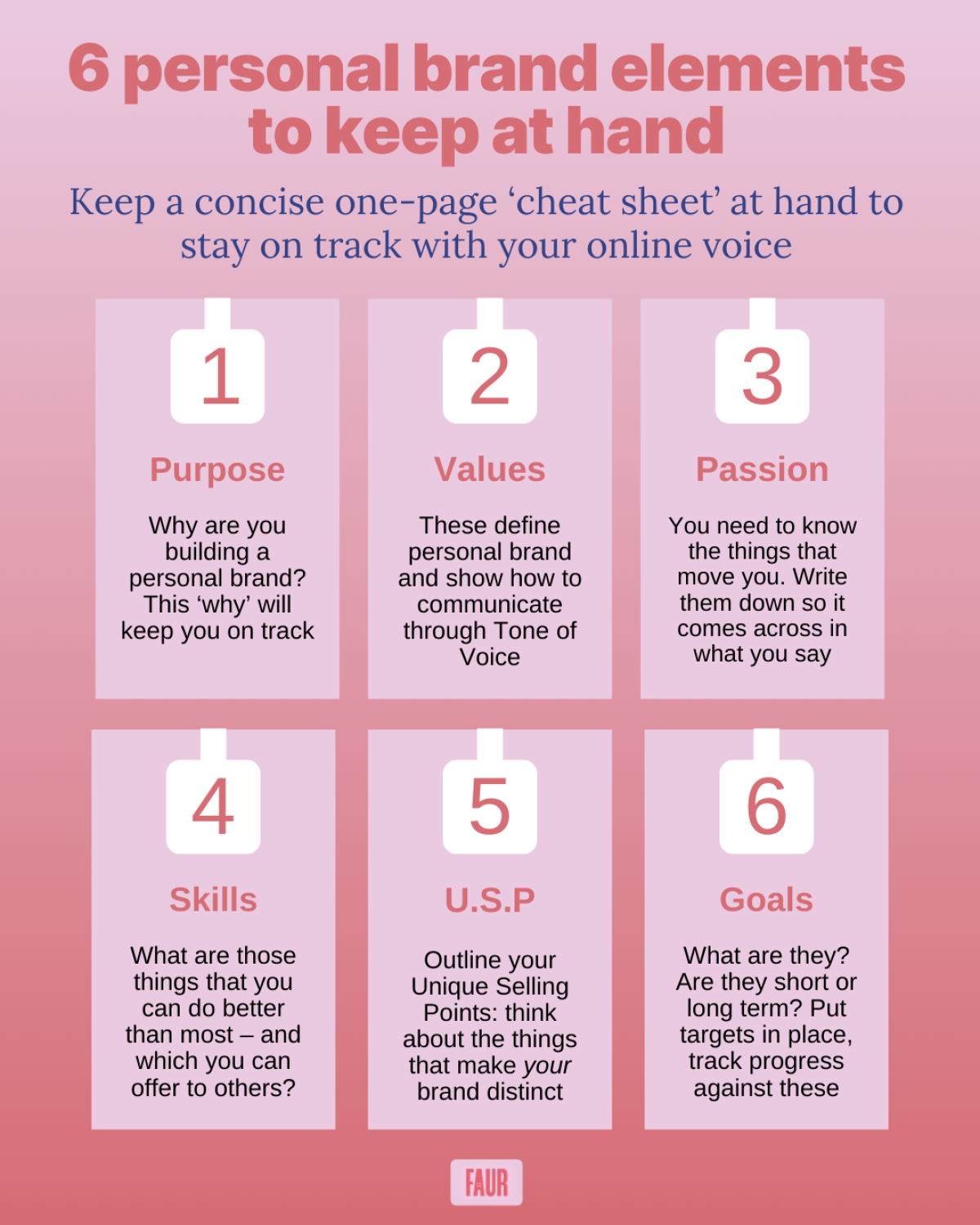 3. Produce and keep handy: a one-page ‘cheat sheet’ of personal brand elements