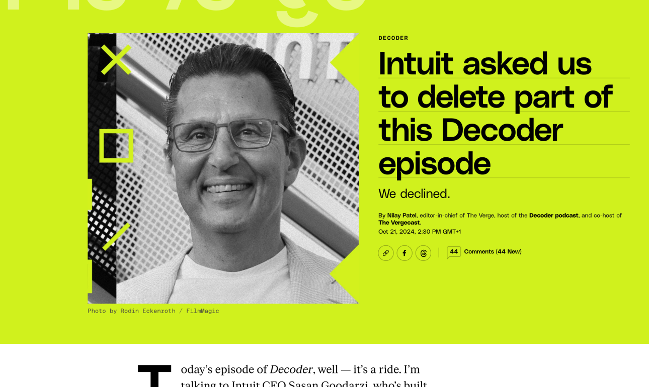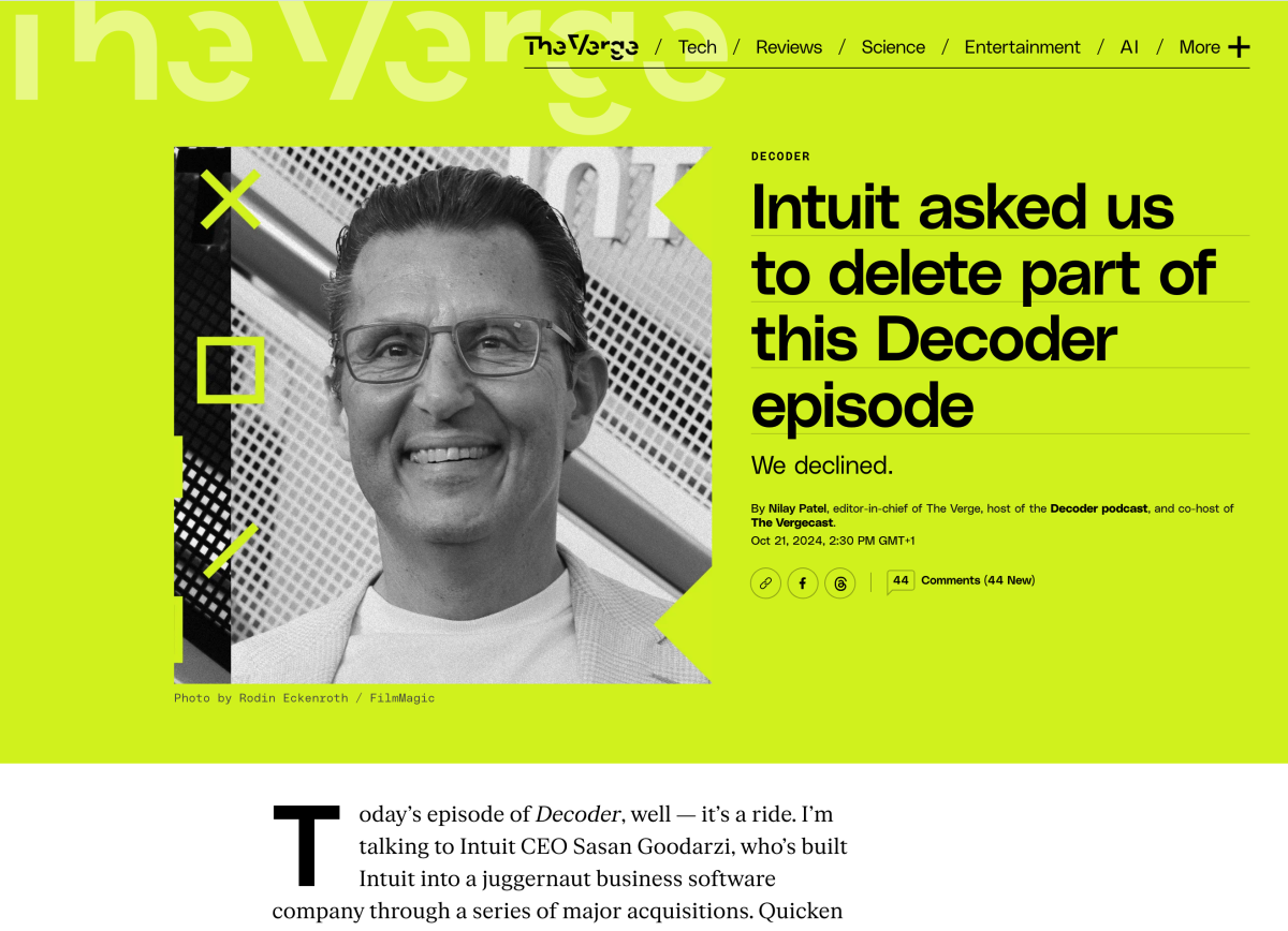 The interview was published on the day that I’m writing this blog, so it’s unclear exactly how big the fallout will be, but it’s already very clear that it won’t be good for Intuit. This is especially bizarre, as Goodarzi answers Nilay’s contested questions fairly well, even if not entirely satisfactorily. But for the intervention, it would likely have raised very few eyebrows.